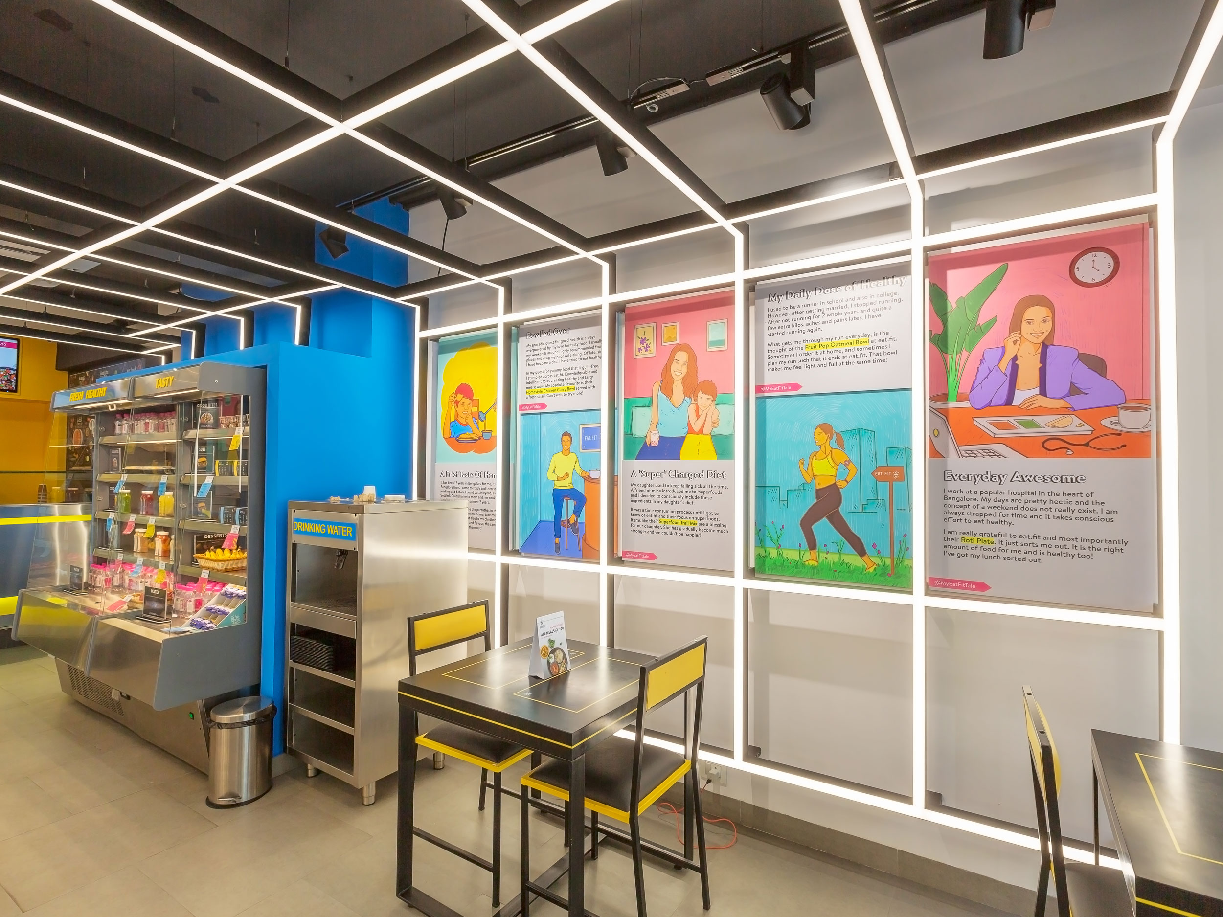 The strategy for the restaurant graphics centered around two broad themes: Telling the brand story & imbuing some light humour in the space. The team created illustrations and colourful graphics highlighting the pillars of the brand, telling customer stories and food based cartoons. The graphics created were the blueprint for Eat.fit restaurant graphics across the country.