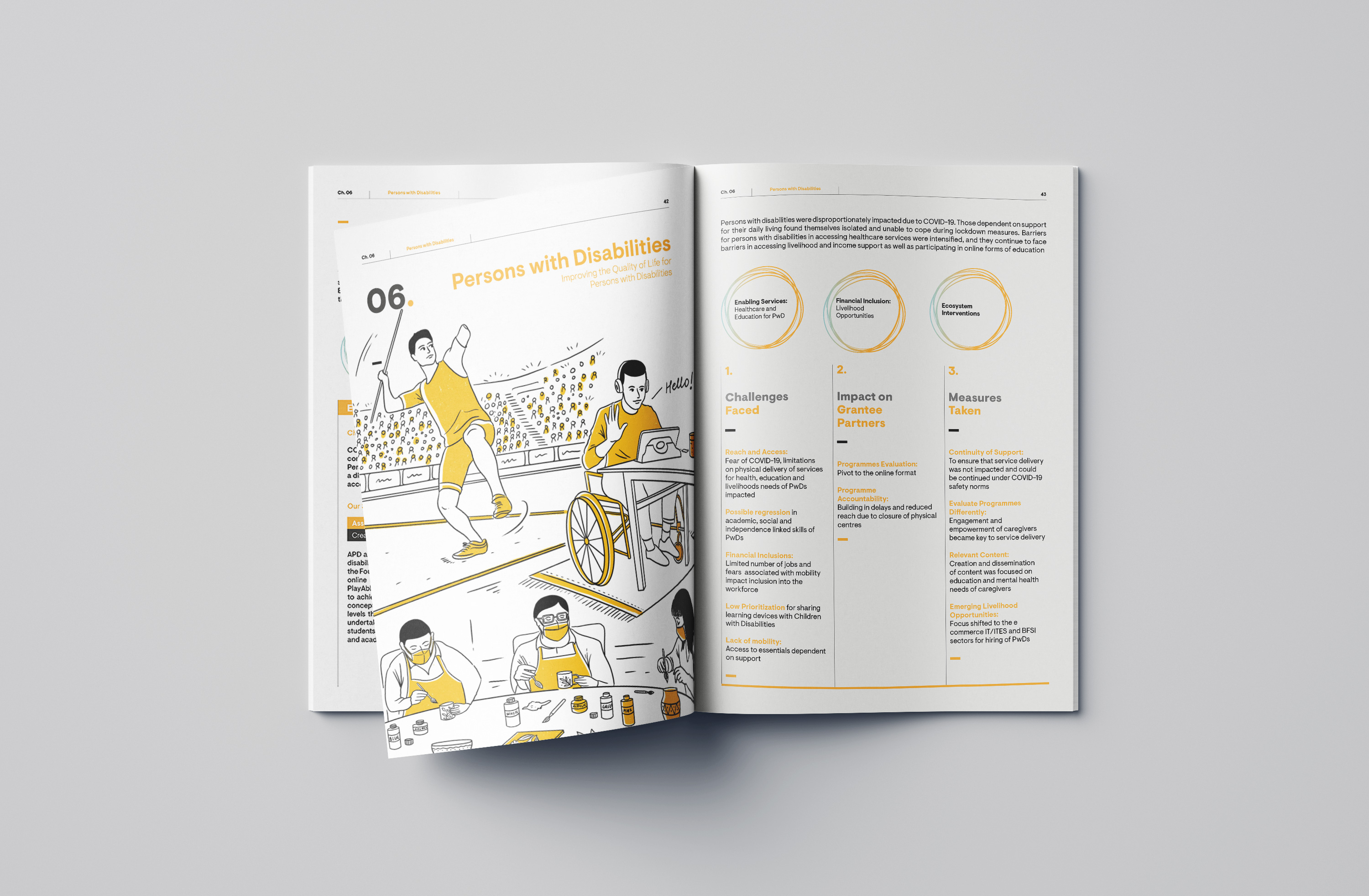 I worked with the lead designer to create 6 chapter illustrations and 1 cover illustration for the 2021 Annual Report. Each chapter covered different topics like education, healthcare, livelihoods and so on and the cover illustrations were introduced to add a visual break from the content heavy nature of the book. The report featured the impact of COVID and looked back on the difficult year that was. Hence the illustration style selected was minimal and black & white with spots of colour.