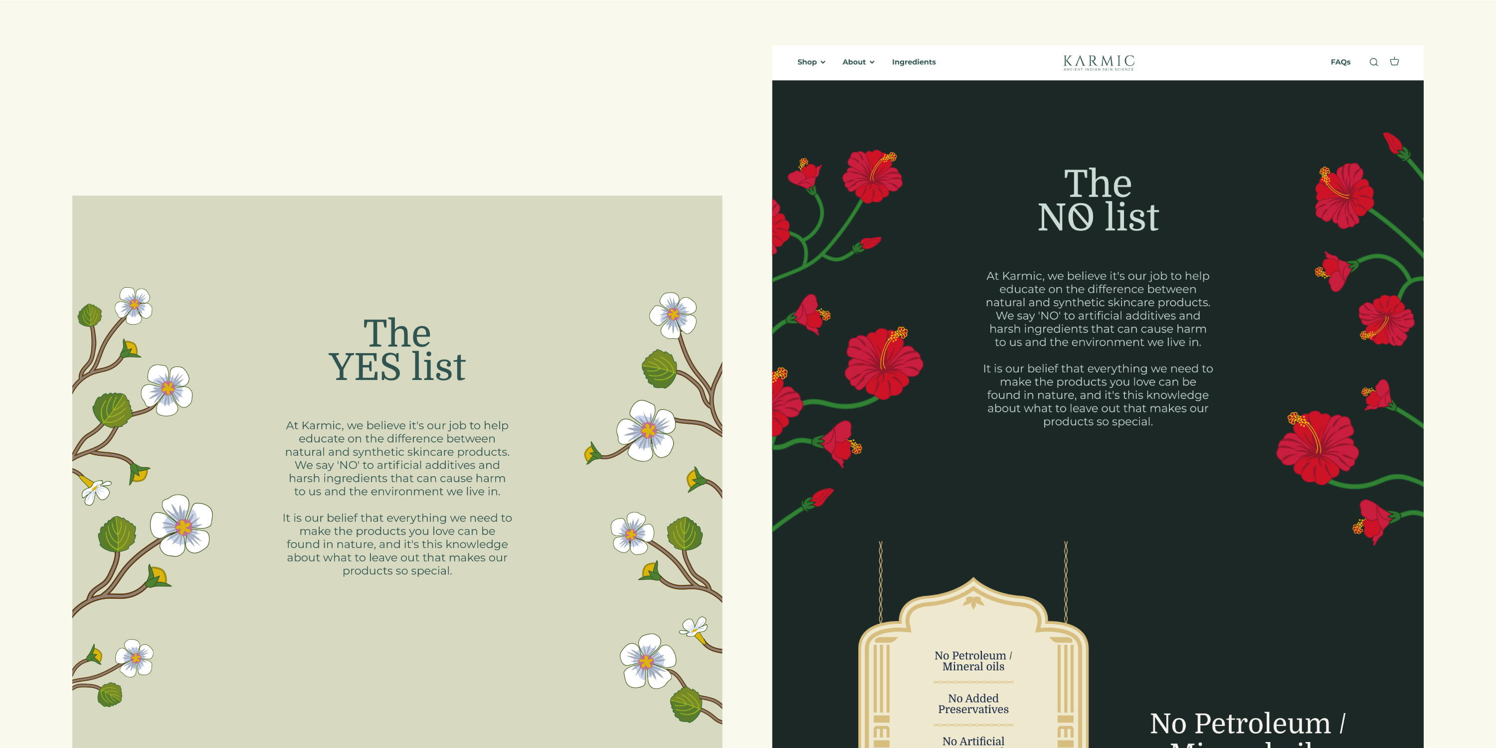 Floral motifs were created from the pacakging illustrations and were sprinkled across the wesbite. The jharokha window motif was used across the website to showcase images. I created additional Pichwai-style illustrations for footers, sign-up banners and a few of the secondary pages.