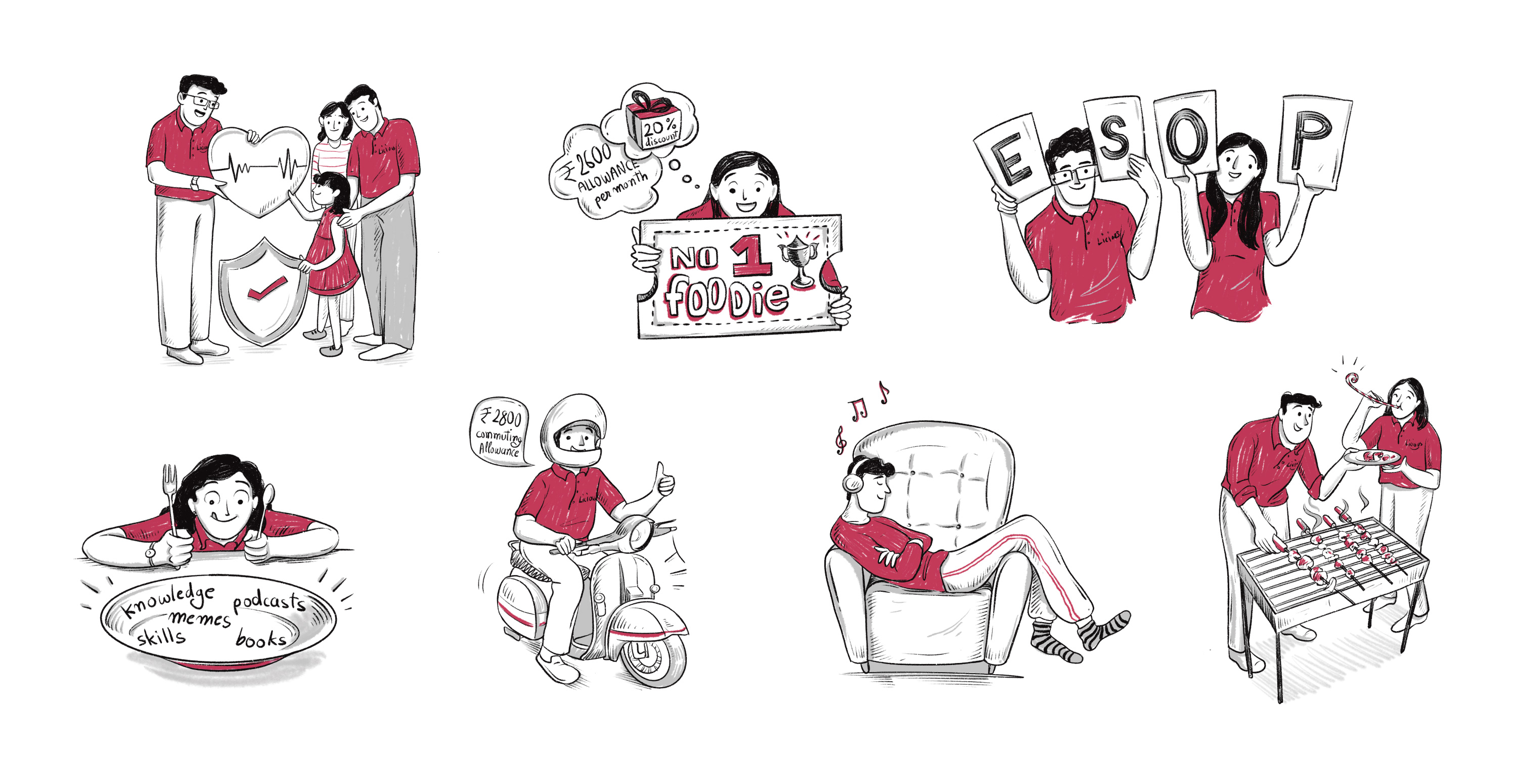 The visual language for the employer branding took cues from the new Licious logo and brand language. The brand tone of voice was warm, light and forthcoming and a lot of our design desicions and visual cues stemmed from that. The new logo had a hand-lettering structure to it and thus the team created the visual unit of the EVP statement in a similar visual aesthetic. The primary brand language was augmented with a couple of new typefaces and styles that complemented it. We took cues from handwritten recipe books and journals and added elements like highlights, handwritten fonts, polaroids, hand-drawn doodles and hand-lettered typography. Comic strips and doodles on company culture and values were introduced to keep the tone light-hearted, warm and approachable.